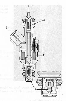 Das Einspritzventil selbst besteht aus dem Ventilkörper mit Einlass (5), der eine Magnetwicklung (2) beherbergt, und einer Düsennadel mit aufgesetztem Magnetanker (1) sowie dem elektrischen Anschluss (3). Bei stromloser Magnetwicklung drückt eine Schraubenfeder die Düsennadel auf einen Dichtsitz am Ventilauslaß. Wird der Magnet nun durch einen Stromimpuls durch das Steuergerät erregt, wird die Düsennadel um etwa 0,1 mm vom Dichtsitz abgehoben und der Kraftstoff tritt durch einen kalibrierten Ringspalt aus. Zur Zerstäubung des Kraftstoffs enthält die Düsennadel einen Spritzzapfen mit Anschliff. Die Anzugs- und Abfallzeit der Düsennadel beträgt etwa 1,0 bis 1,5 Millisekunden. Die eigentliche Gemischbildung (Herstellung eines zündfähigen Kraftstoff- und Luftgemisches; siehe dazu auch Teil 1) findet nun im Saugrohr sowie im Zylinder des Motors statt. Wie bereits oben beschrieben, wird der Kraftstoff vom Einspritzventil vor das Einlaßventil gespritzt. Beim Öffnen des Einlassventiles reißt die angesaugte Luftmenge die Krafstoffwolke mit und bewirkt durch die entstehende Verwirbelung während des Ansaugtaktes (siehe dazu auch Teil 1) die Bildung eines zündfähigen Gemisches. Anschließend wird das Einlassventil geschlossen und der nun wieder hocheilende Kolben verdichtet das Gemisch bis es schließlich gezündet wird. Im nächsten und 5. Teil wird das Steuersystem erläutert. (ud)